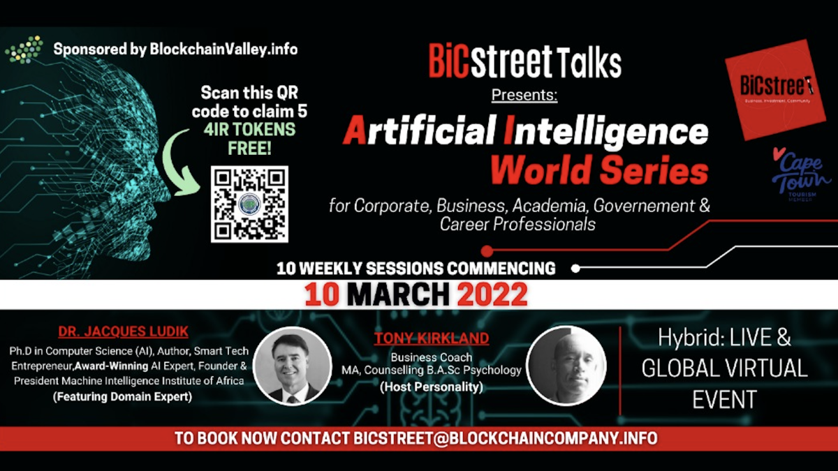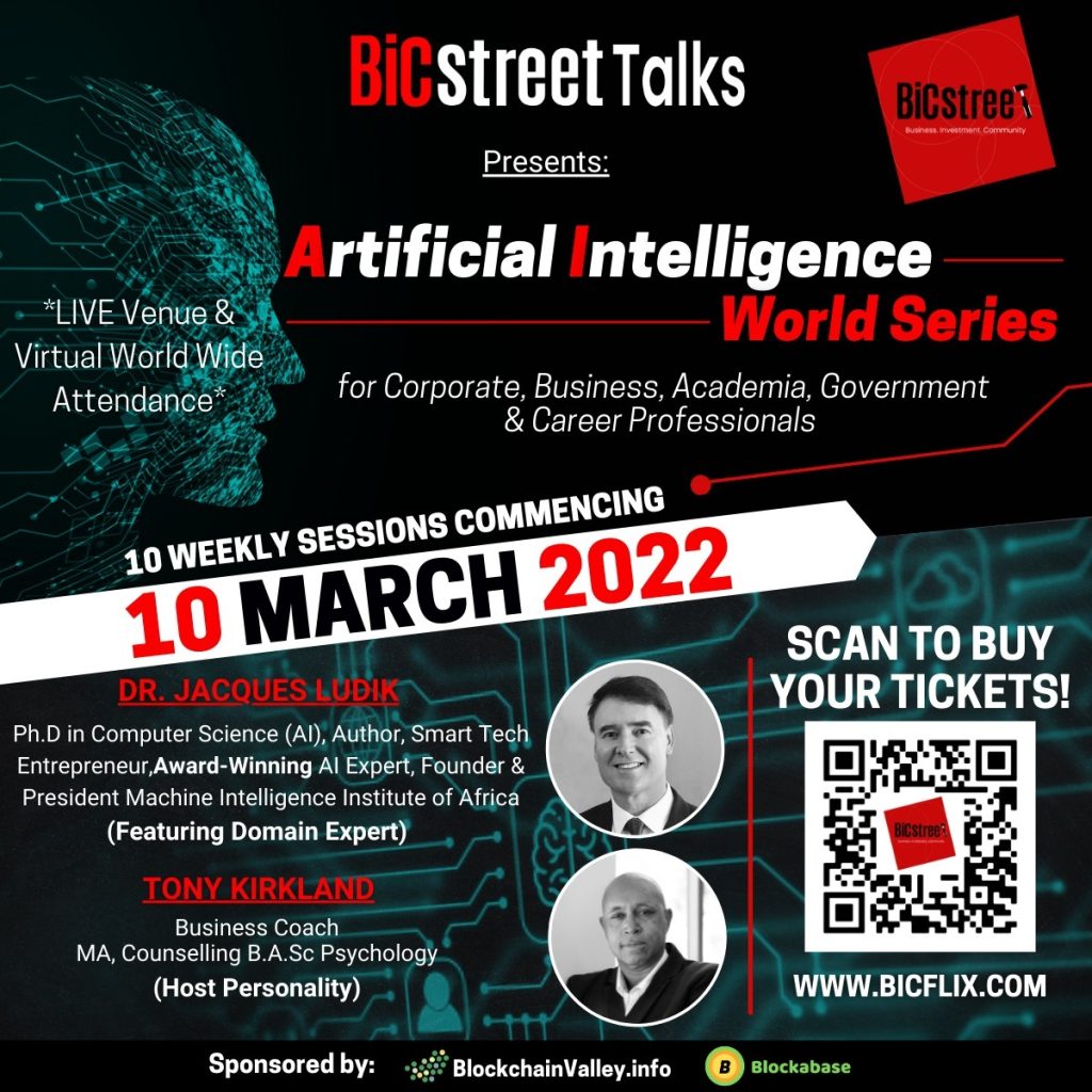 #ArtificialIntelligence World Series interview on Smile 90.4FM. Have a quick listen and book your Virtual Live attendance at BiCstreet.com . You could be one of the first in the world to be issued an “ NFC “ meaning authenticated Non Fungible Certificate, only issued on the blockchain, to professionals who complete 10 weekly exciting interview sessions of this artificial intelligence World Series. Join us to unpack mysteries of #AI for enterprise, corporates, governments, startups and white collar professionals, who need to understand the critical importance of artificial intelligence and strategic implementation for company and business competitiveness. Featuring world leading AI expert and author Dr Jacques Ludik. The full 10 weekly session programme is outlined on BiCstreet.com and Ticket sales is on BiCflix.com, a new Live Streaming and Video on Demand platform for global business events and enterprise content.