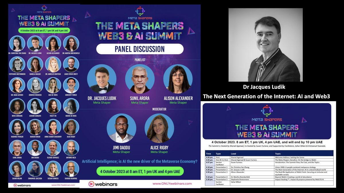 What would the future of economy powered by #web3 & #AI look like? Dr Jacques Ludik will participate along with other speakers at the first Meta Shapers Web3 & AI Summit on 4 October 2023. He will be speaking on “AI and Web3: The Next Generation of the Internet for a Decentralized World”. See also https://www.linkedin.com/pulse/ai-web3-next-generation-internet-decentralized-world-jacques-ludik/